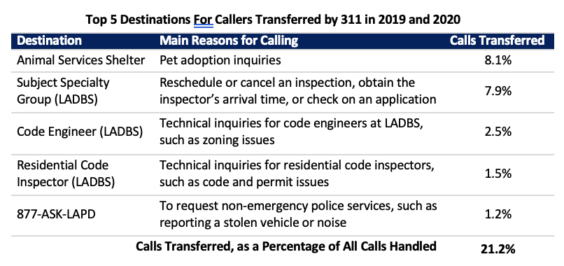 311’s inability to assist many callers stems largely from the way City departments direct their call volume. All public calls for LADBS and non-emergency calls for the Department of Animal Services are first routed through 311, even though it is unable to provide specialized assistance. For example, 311 agents receive and transfer over 70% of calls related to questions about zoning, building codes, and permits that only LADBS staff can answer.