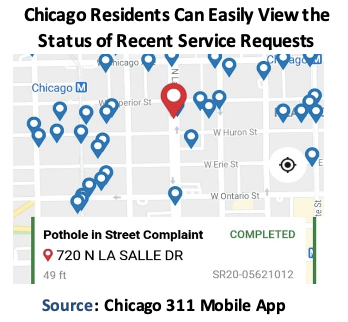 In addition, unlike the practice of other large U.S. cities, 311 in Los Angeles does not give customers estimated completion times for most service requests and cannot force departments to work with it to do so, leaving transparency and accountability by the wayside. Chicago employs a map to allow customers to view the status of recent service requests on its 311 website and app — something Los Angeles should consider to better illustrate how the City is serving them. L.A.’s 311 paradigm also fails to proactively seek customer feedback that could help departments address service delivery and request fulfillment problems.