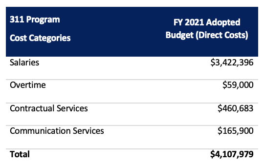 - $30,000 in one-time funding from the Board of Public Works in FY 2018 for marketing and outreach for the 311 call center and mobile app.