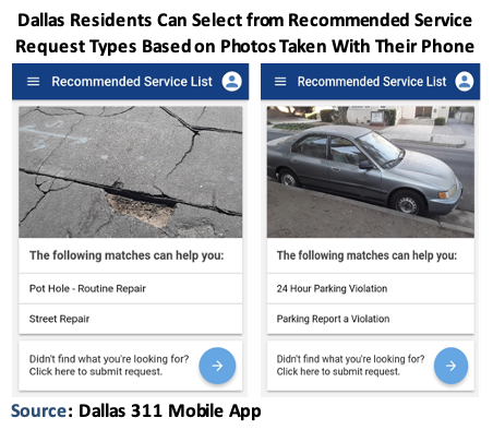 AI’s use cases also extend to making 311 more user friendly. Although San Francisco’s 311 mobile app and website are most popular way for residents to submit service requests, user error caused many requests to be routed to the wrong agency. To improve 311 request routing, San Francisco used its Startup in Resident program to identify a vendor that developed an AI- based solution to identify the correct service fulfillment department. Dallas’ 311 mobile app also uses AI to power an image recognition feature that recommends types of service requests based only on photos taken on a user’s smartphone.