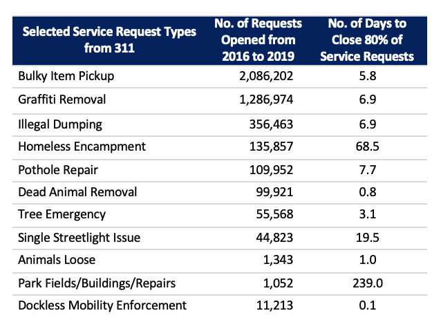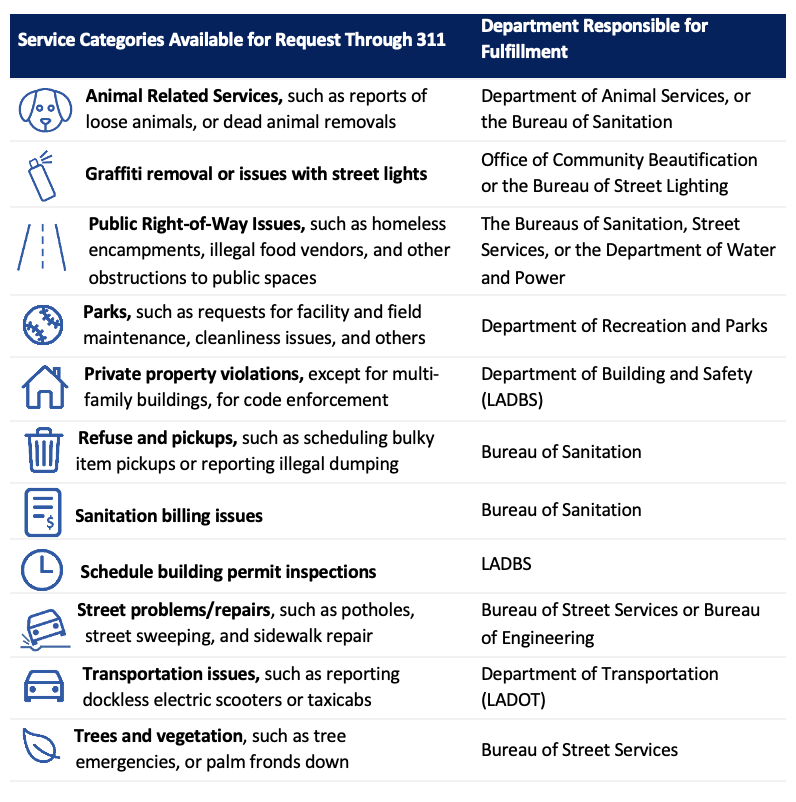 311 programs in other cities had consolidated more service request types, allowing residents to submit the request types listed above through their channel of choice. Los Angeles’ approach for handling routine requests—overlapping in some cases, while siloed in others—impairs 311’s model as a one-stop shop for the most common needs coming from its residents.