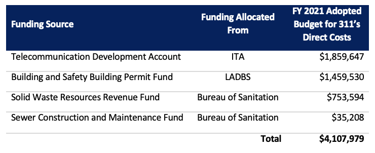 City policymakers should also consider a better way to fund 311’s operations, which currently relies on allocations from special funds used mainly by LADBS and the Bureau of Sanitation. The allocation amount from each fund based on the proportion of calls that 311 answers on their behalf, including transferred calls.