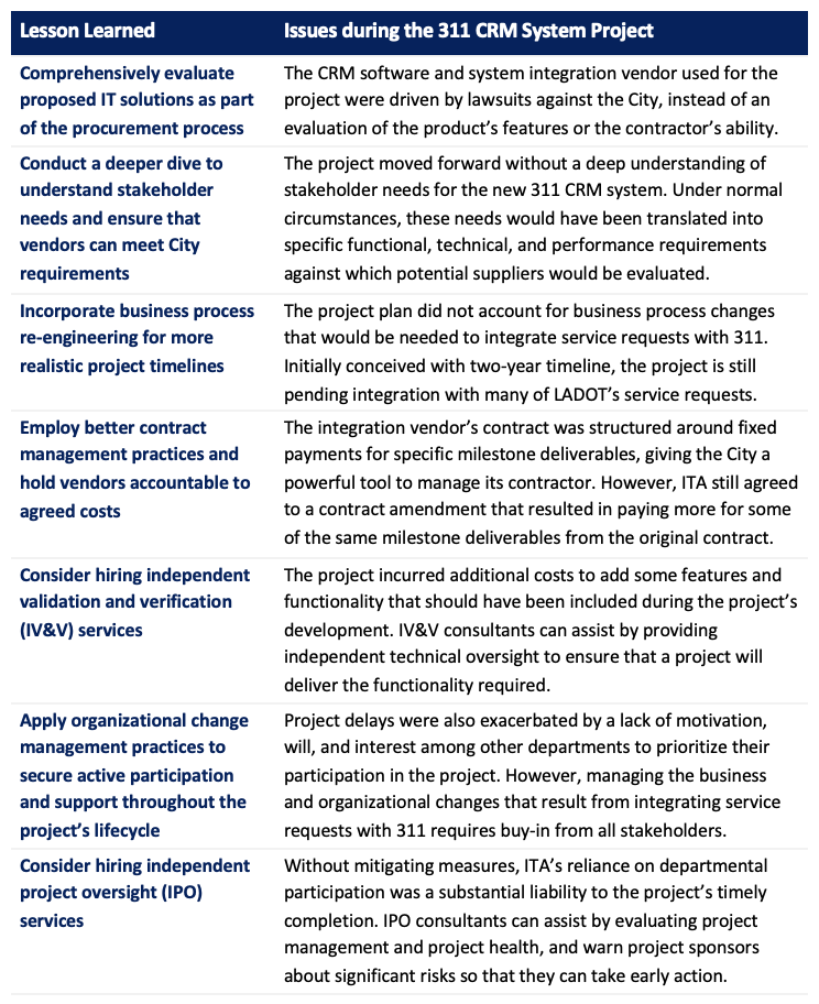 Lessons Learned from the 311 CRM System Project– Five years after going live in January 2016, ITA and other departments have already acknowledged the need to replace the 311 CRM system due to a variety of issues. If the City moves forward with a replacement project, ITA should adopt lessons learned from its implementation of the current system to ensure a more successful project delivery. These include a comprehensive evaluation of proposed IT solutions, better project planning and contract management to minimize delays and cost increases, and hiring consultants to provide independent assessments of project deliverables and risks.