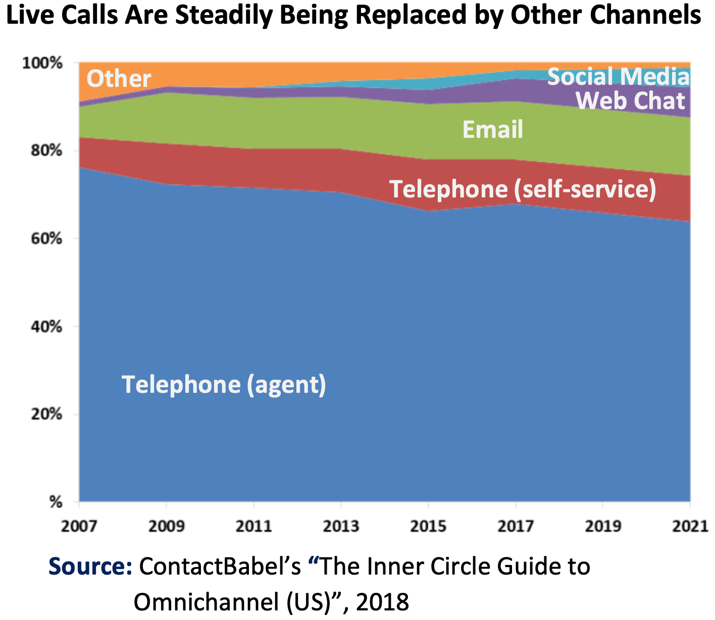 Since then, the customer contact industry has matured from a focus on call centers to a more complex contact center environment offering multiple, integrated contact channels that allows customers to move seamlessly from one contact method to another. According to a study by ContactBabel, a consultancy specializing in the contact center industry, live agent calls in the private sector, as a proportion of all contacts, is projected to decline from 76% in 2007 to 64% in 2021. In its place, other contact channels have grown, especially self-service, email, web chat, and social media. Going forward, the ability to handle different channels in an effective and integrated manner will be vital.