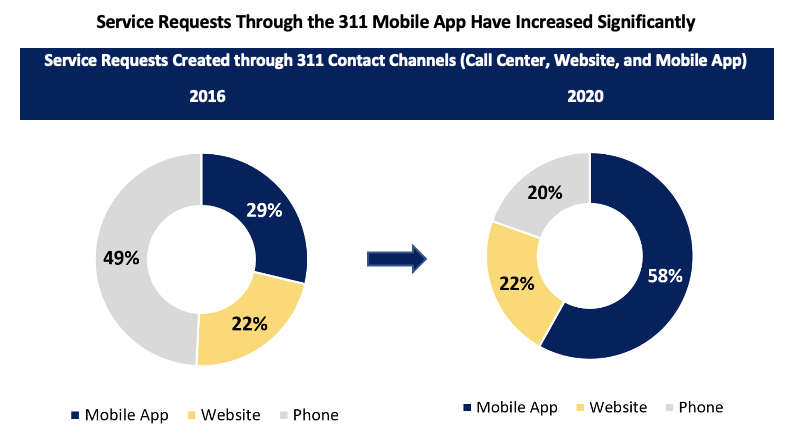 However, service requests submitted online, particularly through 311’s self-service mobile app and website, have increased significantly between 2016 and 2020. When compared to all contact channels operated by different departments across the City, the 311 mobile app and website alone accounted for 39% of requests submitted in 2020. When focusing on just contact channels operated by 311, requests through the mobile app and website make up 80% of requests submitted.
