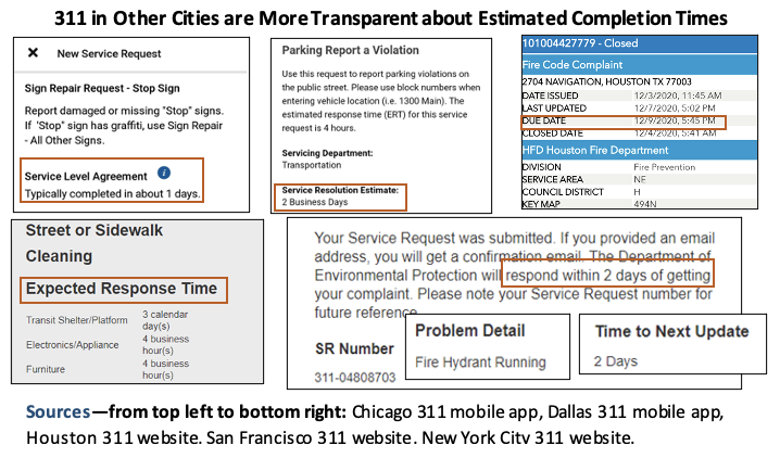 In addition, 311 and other departments do not provide estimated completion times for most service requests types. By contrast, 311 programs in several other cities consider estimated service times essential to their commitment for transparency and accountability. 311 could also enhance services in the City by proactively obtaining end-to-end feedback to help other departments identify and address systemic issues with service fulfillment.