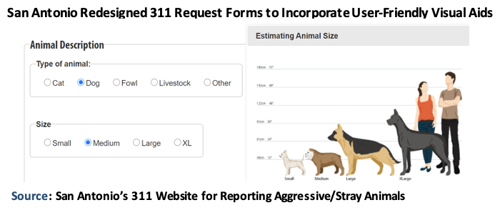 As part of their recent CRM system replacements and upgrades, San Antonio, Dallas, and Chicago each hired consultants to develop a customer engagement process that gathered the public’s input on how to improve 311. As a result, each city made changes to their 311 programs to better meet the needs of their constituents. For example, key findings from San Antonio’s user design study resulted in changes to its 311 service request forms, such as visual aids, to make them easier to use.