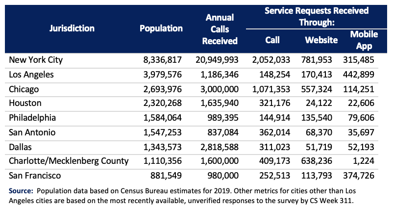 The following cities were chosen as peers to Los Angeles based on comparable population sizes, scale of operations, and their responsiveness to annual surveys from 2017 to 2020 conducted by CS Week 311, an industry group for 311 programs throughout the country.