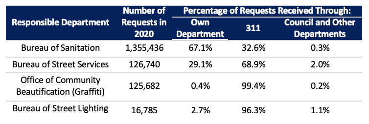 Undercutting its billing as a one-stop shop for neighborhood services is the City’s fragmented approach to service requests. Many departments still utilize their own contact channels to accept and resolve basic service requests. For example, the Bureau of Sanitation’s own call center received more than 700,000 bulky item pickup, dead animal removal and other requests in 2020 — all of which could have been handled through 311. In some cases, 311 does not include routine service requests that should be available in the system, such as reporting parking violations and filing noise complaints. And 311 gets numerous requests that require specialized assistance beyond the program’s scope, which would be better fielded by the departments themselves. All of this causes confusion, increases wait times — a lingering problem — and undermines 311’s mission.