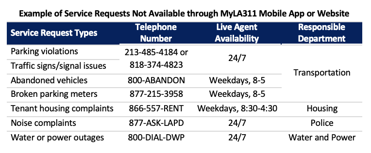 In other cases, many services in Los Angeles cannot be requested through the 311 mobile app or website. Instead, Angelenos can try to call 311 for assistance, or use contact channels created by other departments to report issues—such as reports of parking violations and abandoned vehicles, fire safety issues, and noise complaints—because those departments have not integrated their service requests with 311.