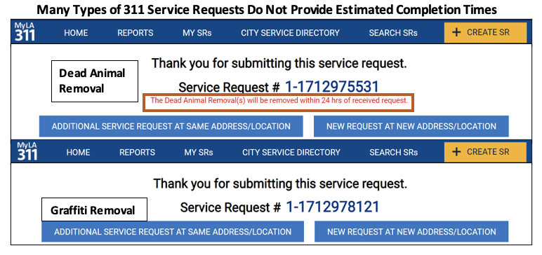 In a customer-driven business world of real-time status updates and 2-day delivery promises, providing estimated service times should be a common practice for services requested through 311 in Los Angeles. However, managing the reluctance by some departments to provide estimated service times is outside of 311’s authority and is a cause that requires support and sponsorship from City policymakers.