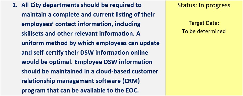 | Require departments to maintain a complete and current listing of their employees’ contact information, including skillsets and other relevant information. | In progress | Executive Directive 26 required all City departments to identify a minimum of 10 percent of their employees for a DSW bench list that can be made available immediately. Personnel manages the Citywide bench list, but does not have a process to regularly update it. |