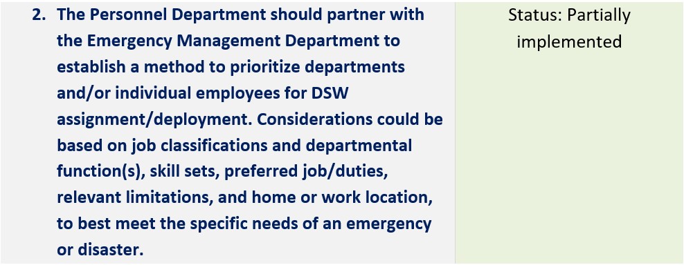 | Establish a method to prioritize departments and/or individual employees for DSW assignment/deployment. | Partially Implemented | Personnel currently uses the bench list created to support the City’s COVID-19 response as its primary method of prioritization. However, this one time-survey does not fully satisfy the intent of the recommendation since the list is only effective throughout the duration of the City’s pandemic response. |