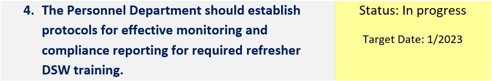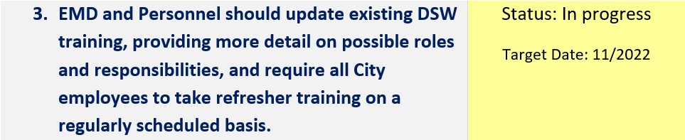 | Update existing DSW training, providing more detail on possible roles and responsibilities, and require all City employees to take refresher training on a regularly scheduled basis. | In progress | DSW training courses are currently available on Cornerstone, the City’s online training platform. All employees are required to complete an initial course during onboarding which provides an overview of the DSW program. Additional refresher videos are available to all City employees but are not yet required. |