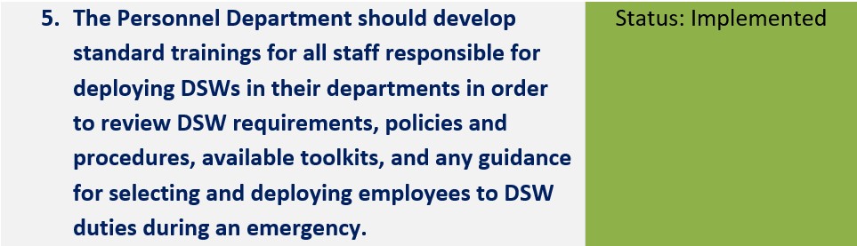 | Develop standard trainings for all staff responsible for deploying DSWs in their departments in order to review DSW requirements, policies and procedures, available toolkits, and any guidance for selecting and deploying employees to DSW duties during an emergency. | Implemented | Personnel has created a training video that provides information about the role Department Personnel Officers (DPOs) play in DSW deployment. Personnel will assign this training video to DPOs annually as a refresher. |