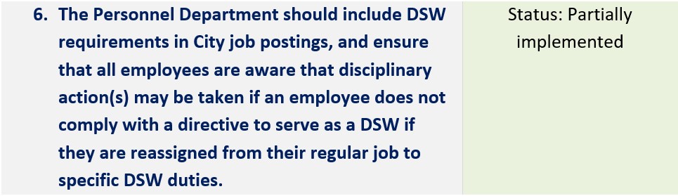 | Include DSW requirements in City job postings, and ensure that all employees are aware that disciplinary action(s) may be taken if an employee does not comply with a directive to serve as a DSW if they are reassigned from their regular job to specific DSW duties. | Partially Implemented | City job bulletins currently state that City employees are required to serve as DSWs. Employees are also required to sign a DSW acknowledgement form. EMD is in the process of developing an official memorandum describing DSW requirements and policies. |