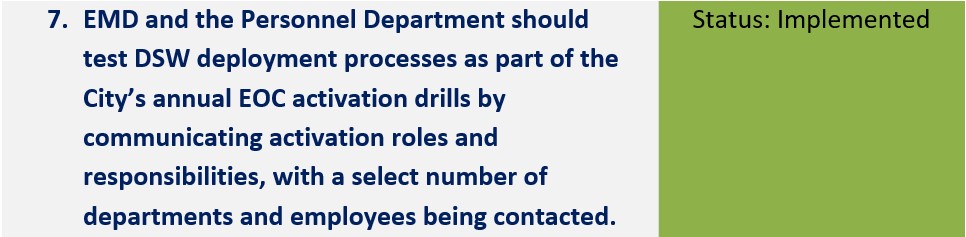 | Test DSW deployment processes as part of the City’s annual EOC activation drills by communicating activation roles and responsibilities, with a select number of departments and employees being contacted. | Implemented | The Emergency Management Department (EMD) now tests the DSW program as part of their annual Emergency Operations Center activation exercise. EMD should continue to test DSW deployments on a regular basis to verify departments’ employee mobilization and deployment capabilities. |