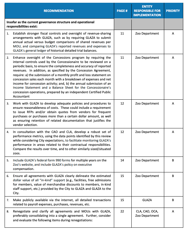 GLAZA also disagreed with Recommendation No. 7, to make publically available via the internet, all detailed transactions related to its payroll expenses, purchases, revenues, etc., –similar to type of City and Zoo financial transaction details provided on the Controller’s website via ControlPanel LA. GLAZA indicated that it is a private, not-for-profit entity governed by its Board of Trustees, whose Audit Committee supervises and accepts its annual independent financial audit and IRS Form 990, noting that it now posts those documents on the Zoo’s website. While GLAZA may not be required to publically share its detailed transaction-based information, it exists solely to support a government entity –the Los Angeles Zoo. As such, the Controller believes that it should provide the same level of detailed financial transparency that the City (including the Zoo Department) makes available to the public.