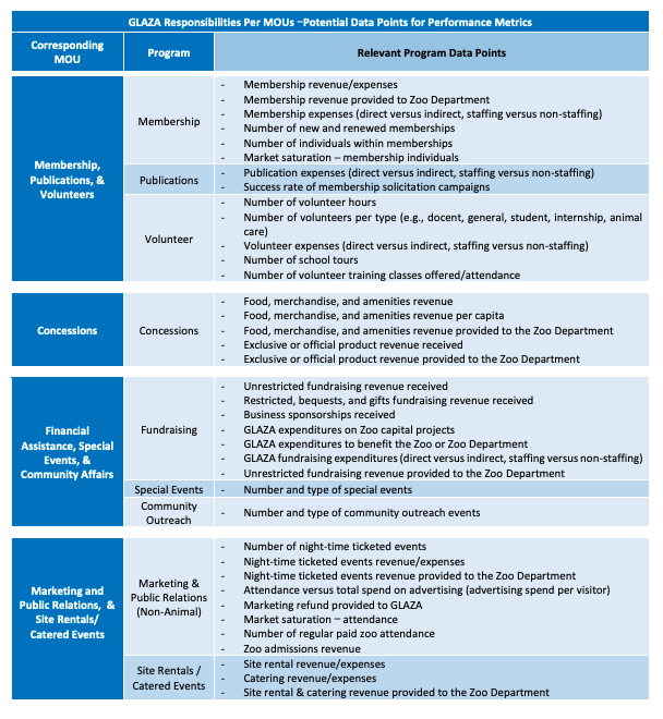 Accountability & Performance Metrics: The agreements with GLAZA (i.e., Operating Agreement, Concession Agreement, and four MOUs) do not specify the extent of oversight the Zoo Department is required to provide over GLAZA. Based upon our review and confirmed through interviews, Zoo Department oversight of GLAZA has been limited as the Zoo Department has significant staffing shortages. Our review found that the agreements (i.e., Operating Agreement, Concession Agreement, and four MOUs) contained few metrics, and they are insufficient to monitor GLAZA’s performance. In the near-term, we recommend the Zoo Department, working with the assistance of the Office of the Chief Legislative Analyst (CLA) and the Office of the City Administrative Officer (CAO), in consultation with GLAZA, establish a robust set of metrics tied to City expectations for GLAZA’s performance related to its contractual responsibilities and the intention of the GLAZA Board to support the Zoo’s overall success. Performance results should be compared against targets, as well as to the performance of prior years and to other similarly sized/situated zoos. Noted differences in planned versus actual results should be analyzed and addressed. This review includes suggested data points that could be used to develop performance metrics.
