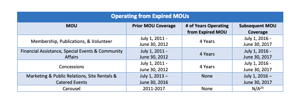 Subsequent audits by the Controller’s Office in 2005 and 2009 noted that recommendations relating to the City Attorney providing a legal opinion on the possible over-retention of shared revenues remained outstanding, and noted the Zoo Department and GLAZA had been operating from expired MOUs. The 2009 audit also recommended the Zoo Department complete a cost- benefit analysis on the feasibility of directly contracting for concession services. However, due to reported staffing shortages, the Zoo Department did not conduct this cost-benefit analysis.