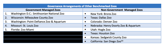 Based upon our benchmarking, other government managed zoos are receiving supplemental funding for operations through a dedicated portion of sales or property tax. Further, one government managed zoo received a unique entity designation, while another government managed zoo reported positive results when it reduced the function of its associated not-for- profit to focus primarily on fundraising. Specifically: