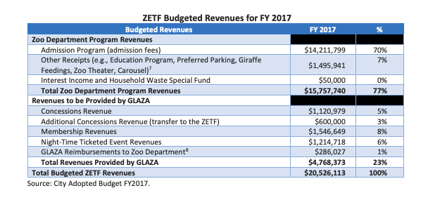 Funds available in the ZETF are generated from Zoo Department receipts (primarily admission fees) and a portion of revenues generated by GLAZA for their managed programs, as transferred to the City. For FY 2017, the Zoo Department’s adopted budget indicated 77% of ZETF revenues would come from the Zoo Department programs; while 23% would come from GLAZA, as an allocation of shared revenues under terms of the Operating Agreement, Concession Agreement, and MOUs. See the Table below.