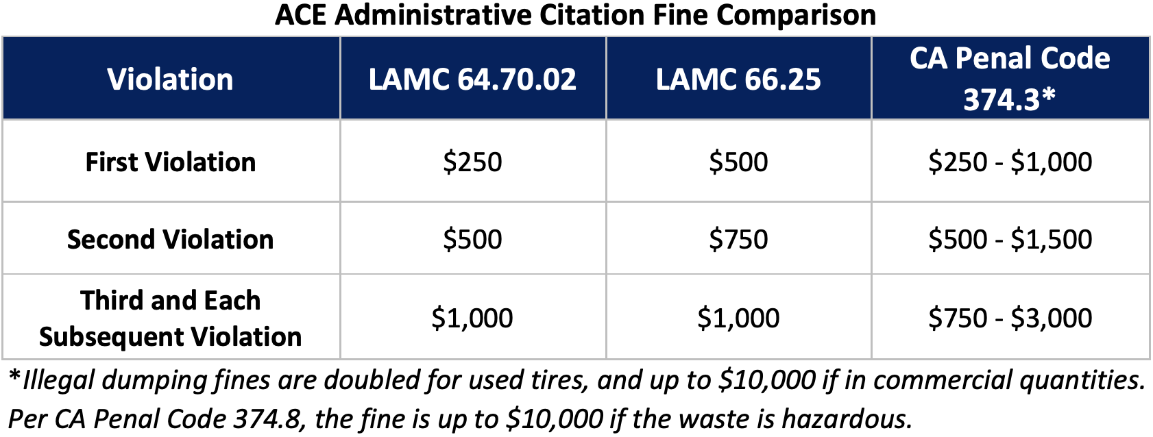 Given the impact illegal dumping has on both the environment and local communities, the City should consider increasing administrative fine amounts in order to deter would-be violators, and assess a fine that reflects the seriousness of the violation. In evaluating whether to increase administrative penalties for LAMC 64.70.02 and 66.25 violations, City officials should consider the fine levels established by the State’s Penal Code.