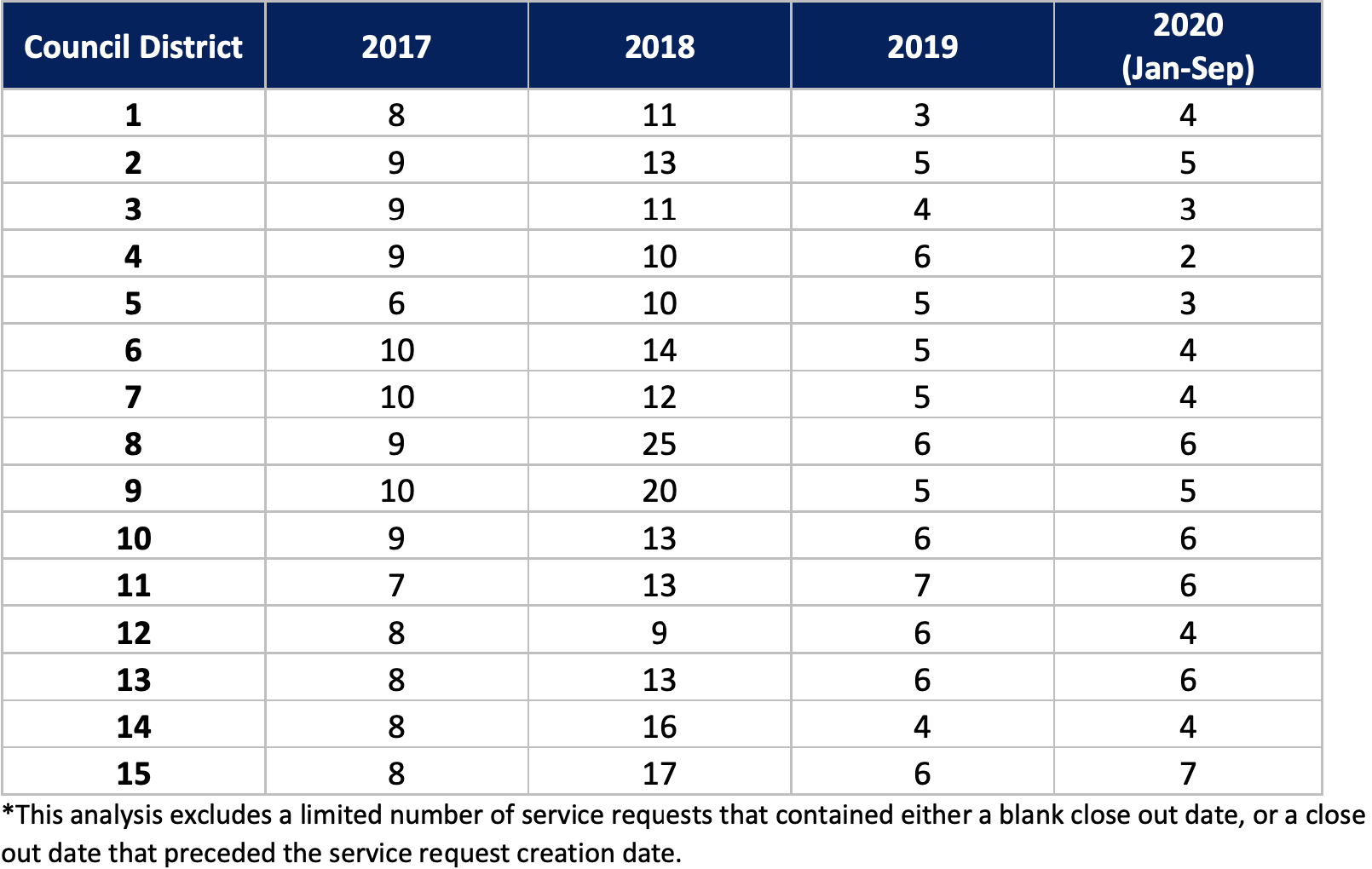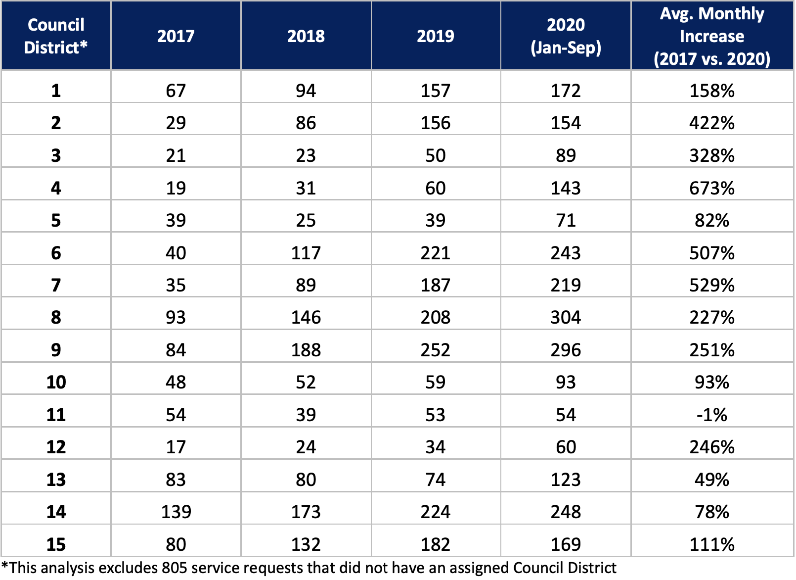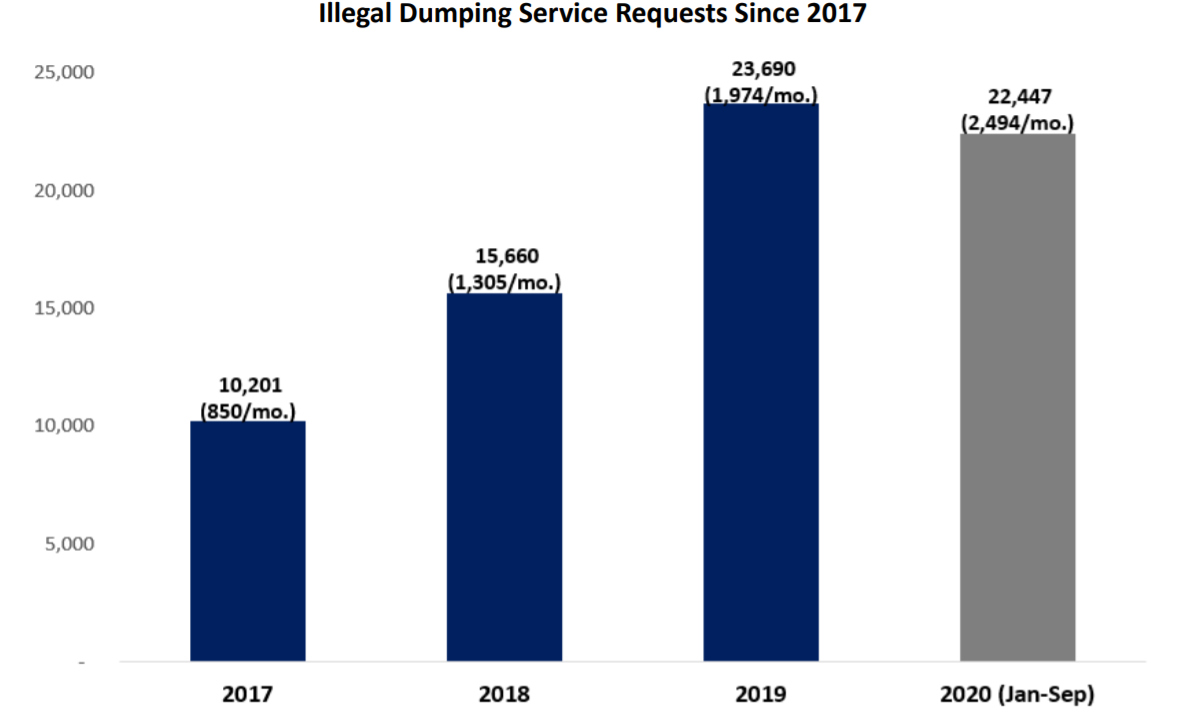 Certain City Council Districts have seen substantial increases in the number of illegal dumping reports. From January through September 2020, Council Districts 2,3,4,6,7, and 9 saw the average number of service requests per month increase more than 250 percent compared to 2017.