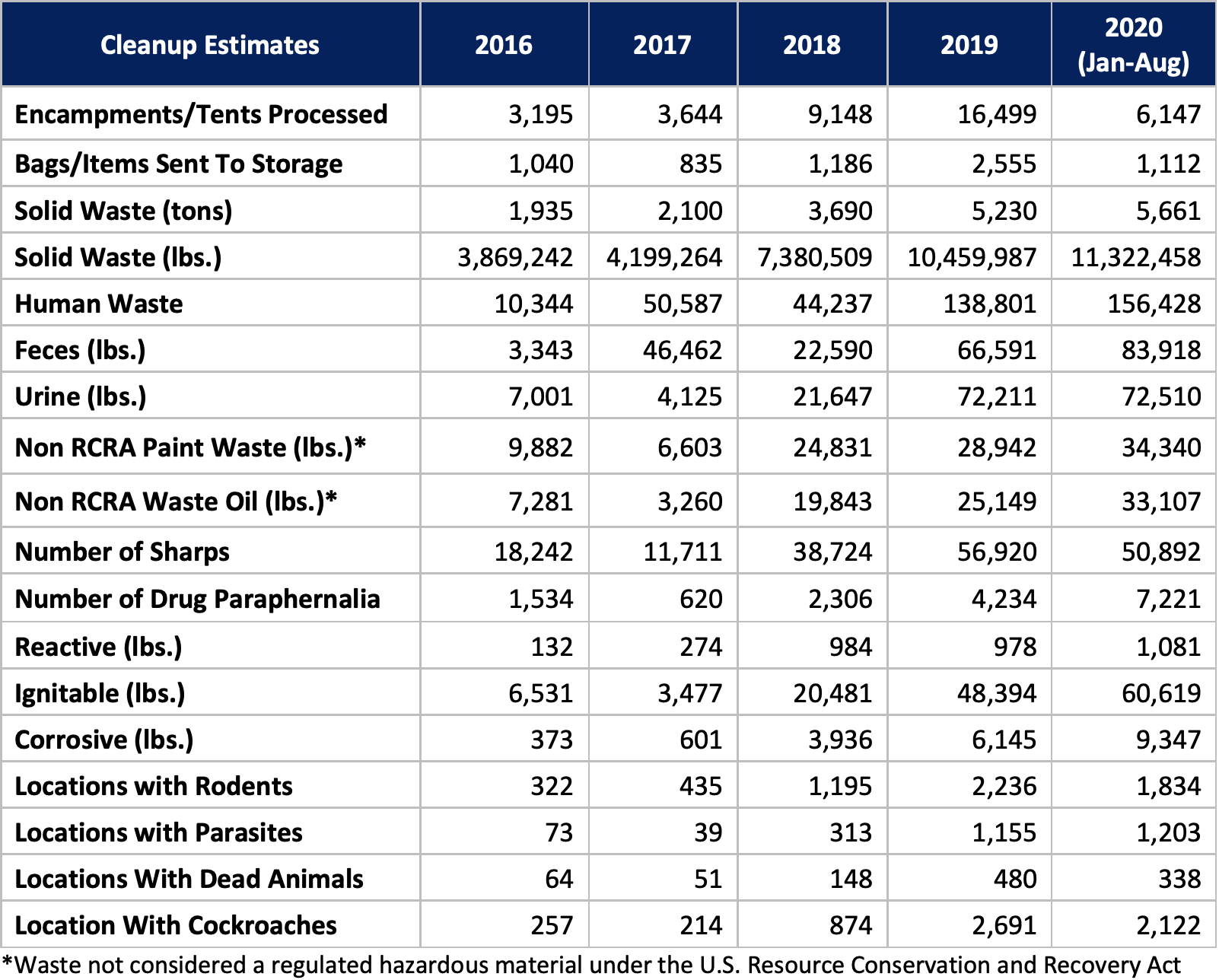 Importantly, illegal dumping in the PROW also impacts the City’s unsheltered residents, as illegal dumpers sometimes target areas with encampments when illegally dumping waste and debris. This exacerbates poor sanitary conditions at encampments, creating additional health and safety risks. For example, LASAN estimates that from January through August of 2020, crews collected the following amounts and types of waste during homeless encampment cleanups: