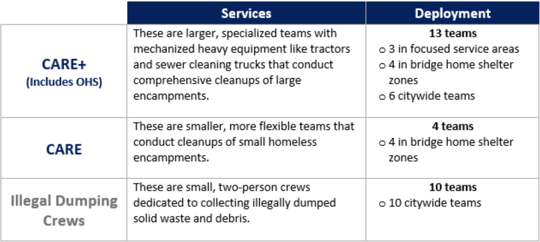 There are currently two distinct types of teams under the CARE Program, while OHS crew makeup has remained largely the same. The Livability Services Division also deploys small teams to illegal dumping sites throughout the City. All crews focus on mitigating PROW hazards, and improving public health conditions. The services, staffing, and geographic responsibilities of Livability Services Division teams as of February 2021 are described in the chart below.