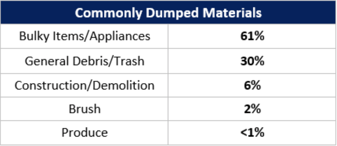 - Establish an interdepartmental working group to identify trends and coordinate illegal dumping enforcement activities.