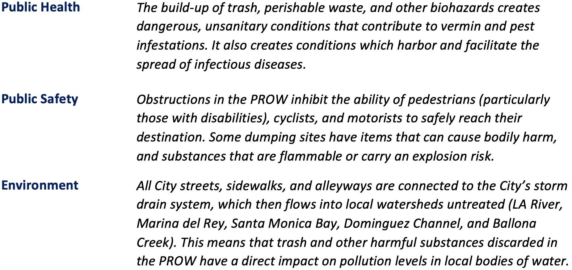 However, far too often, businesses and individuals are choosing to illegally dump garbage, debris, and other harmful substances in the City’s PROW. In certain parts of the City, piles of waste and debris are becoming increasingly common. Illegal dumping is a major contributor to urban blight, but the impact on local communities does not stop there. Illegal dumping also creates serious public safety hazards, public health risks, and environmental damage. Given these risks, it is critical that the City does its part to prevent and deter bad actors from harming our communities.