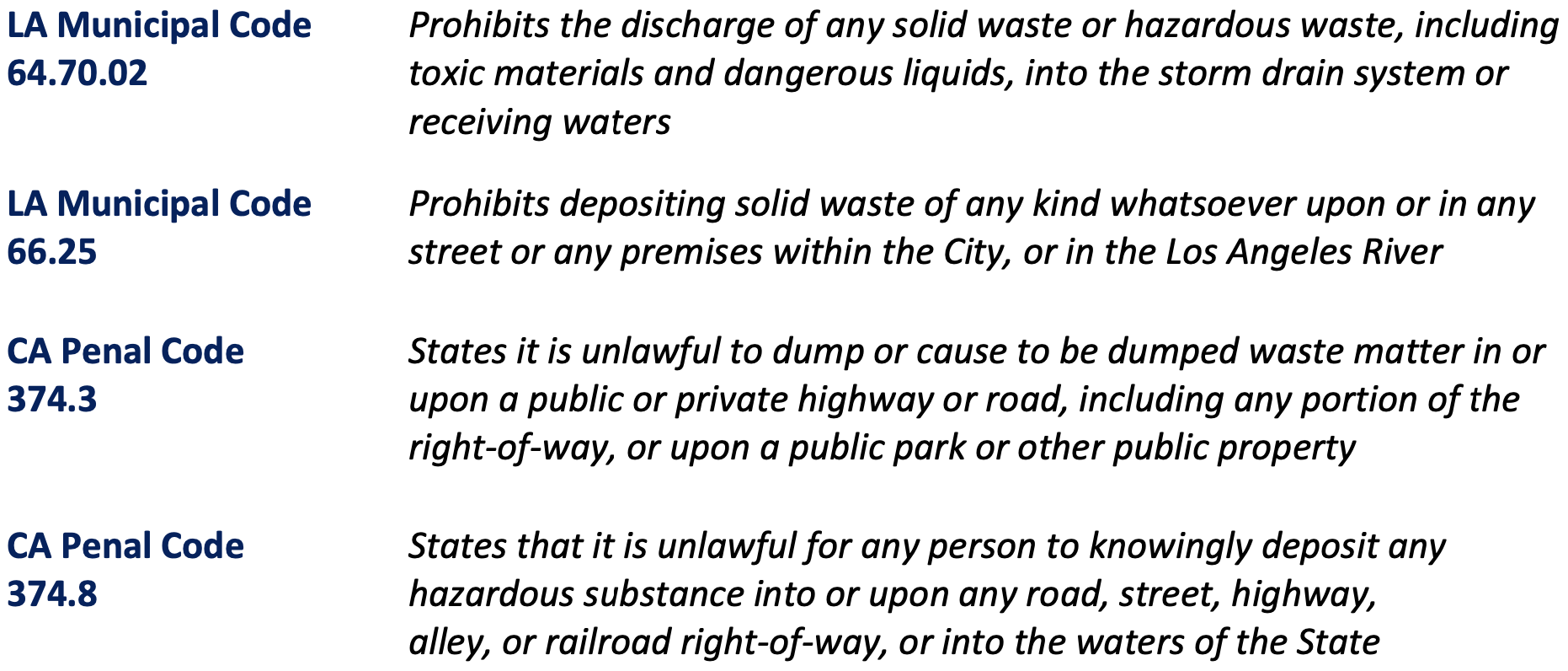 Multiple federal, State, and local laws prohibit dumping waste illegally in public spaces. Management of the City’s stormwater system and illegal dumping abatement programs is also subject to federal and State regulation due to its impact on local water quality. Although LASAN is the lead City department responsible for illegal dumping abatement and watershed protection, there are other City departments that play a role in combating illegal dumping.