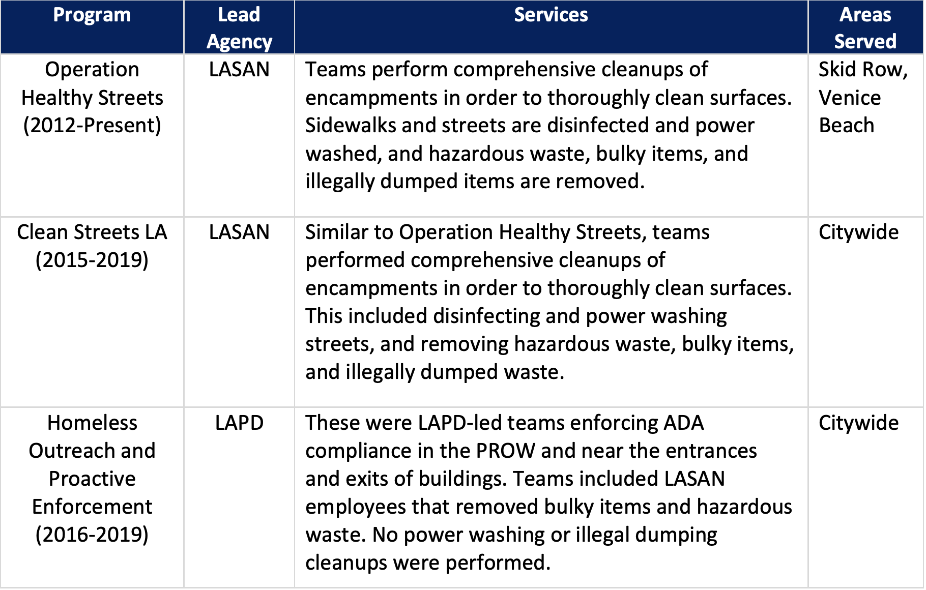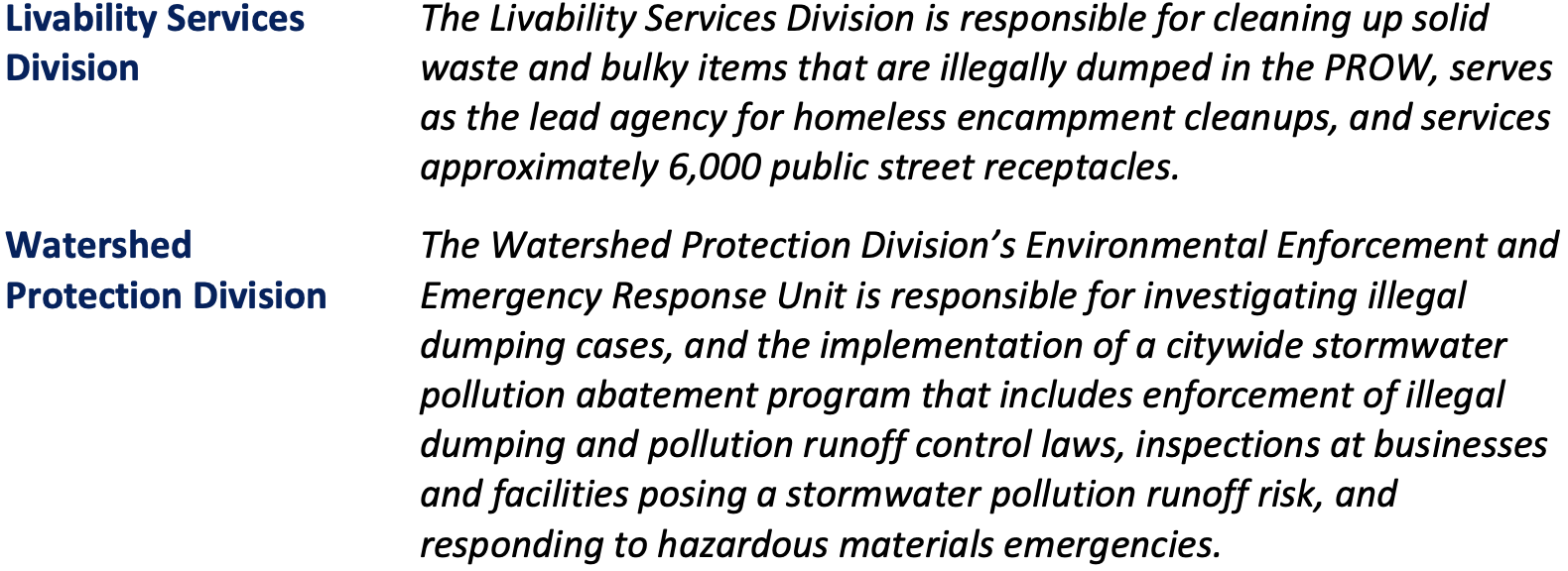 Specifically, other departments with law enforcement powers, including the Bureau of Street Services (BSS) and the Los Angeles Police Department (LAPD), support the City’s cleanliness and public health efforts by enforcing illegal dumping and other PROW safety laws. The Recreation and Parks Department enforces illegal dumping laws in parks, and cleans up illegally dumped waste on park property.