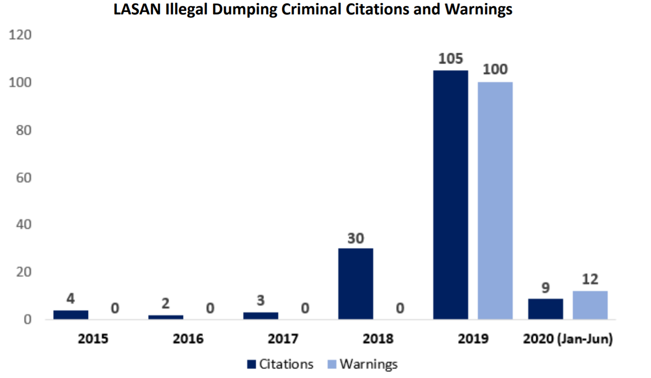 - More should be done to address the sources of illegal dumping – The City needs to be more aggressive in eliminating illegally dumped waste generated by businesses, residents, and construction projects. Specifically, the City could benefit from a concerted and coordinated public awareness campaign that makes Angelenos aware of the harmful impacts of dumping, and advertises free and low-cost options for disposing of excess waste and bulky items. The City should also bolster its oversight of businesses and construction projects to ensure they are properly disposing of waste.