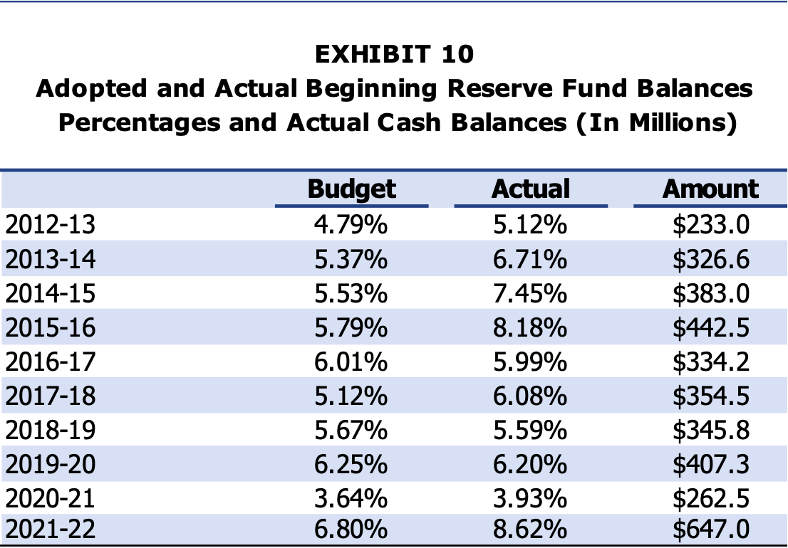 Exhibit 10, below, shows Adopted and Actual Beginning Reserve Fund Balances for last ten years.