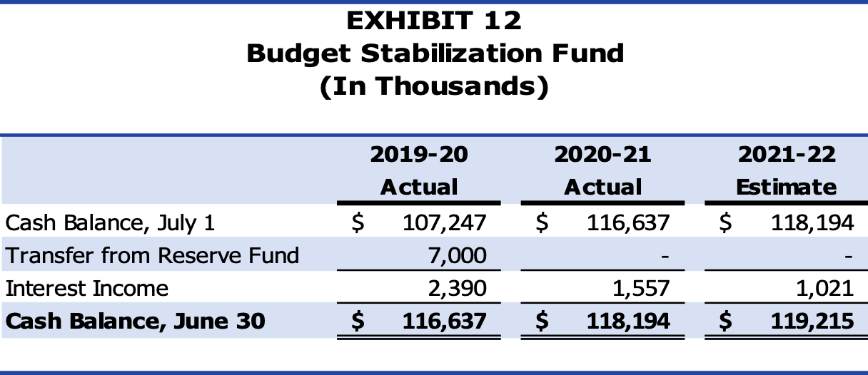 The Budget Stabilization Fund (BSF) is the City’s mechanism for accumulating excess tax revenues in growth years in order to mitigate shortfalls in lean years. During the year, the BSF was proposed to be used as part of the budget balancing solution. However, as it turned out, such action was unnecessary, and the June 30, 2021 balance in the Fund was $118.2 million.