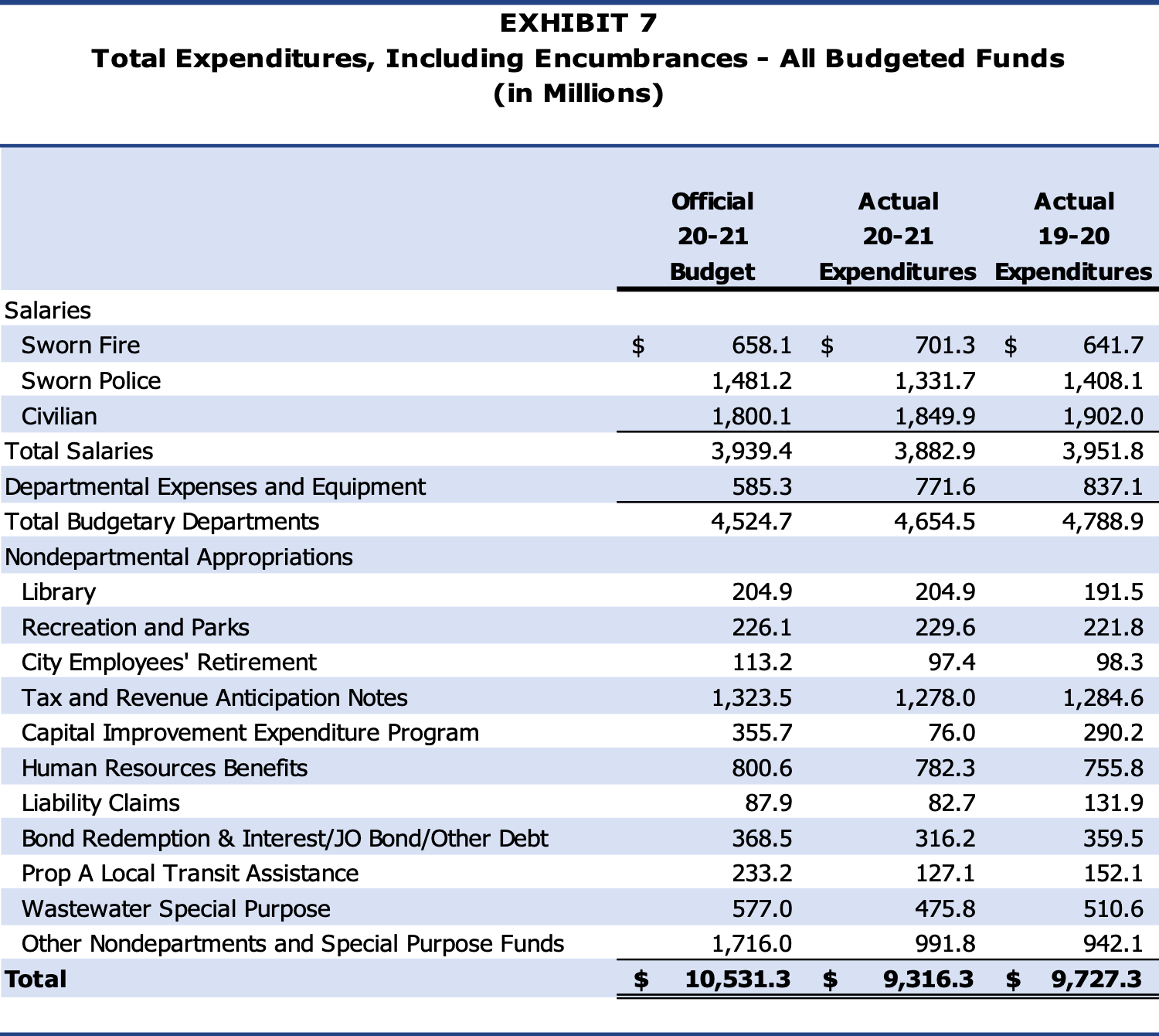 Exhibit 7 below breaks out summarized categories of budgetary and actual expenditures and encumbrances for 2019-20 and 2020-21. Detailed information by department can be found in Schedule IV.
