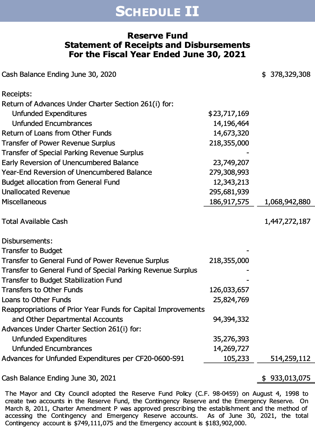 The Reserve Fund is a major indicator of the City’s fiscal health, and is vital to cash flow, bond ratings, and the ability to manage financial challenges as we did in 2019-20, when almost $200 million from the Reserve Fund to balance the General Fund revenue shortfall.
