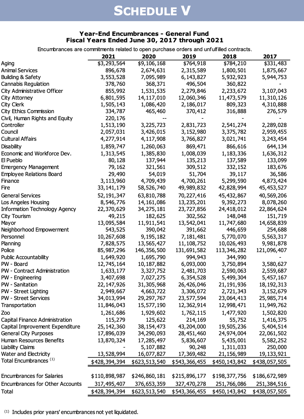 The City ended the Fiscal Year with a total of $516.4 million in encumbrances: $356.8 million in the General Fund and $159.5 million in special funds, $110.9 million was encumbered for salaries to be paid in July 2021, with the balance encumbered in expense, equipment, and special fund project accounts.