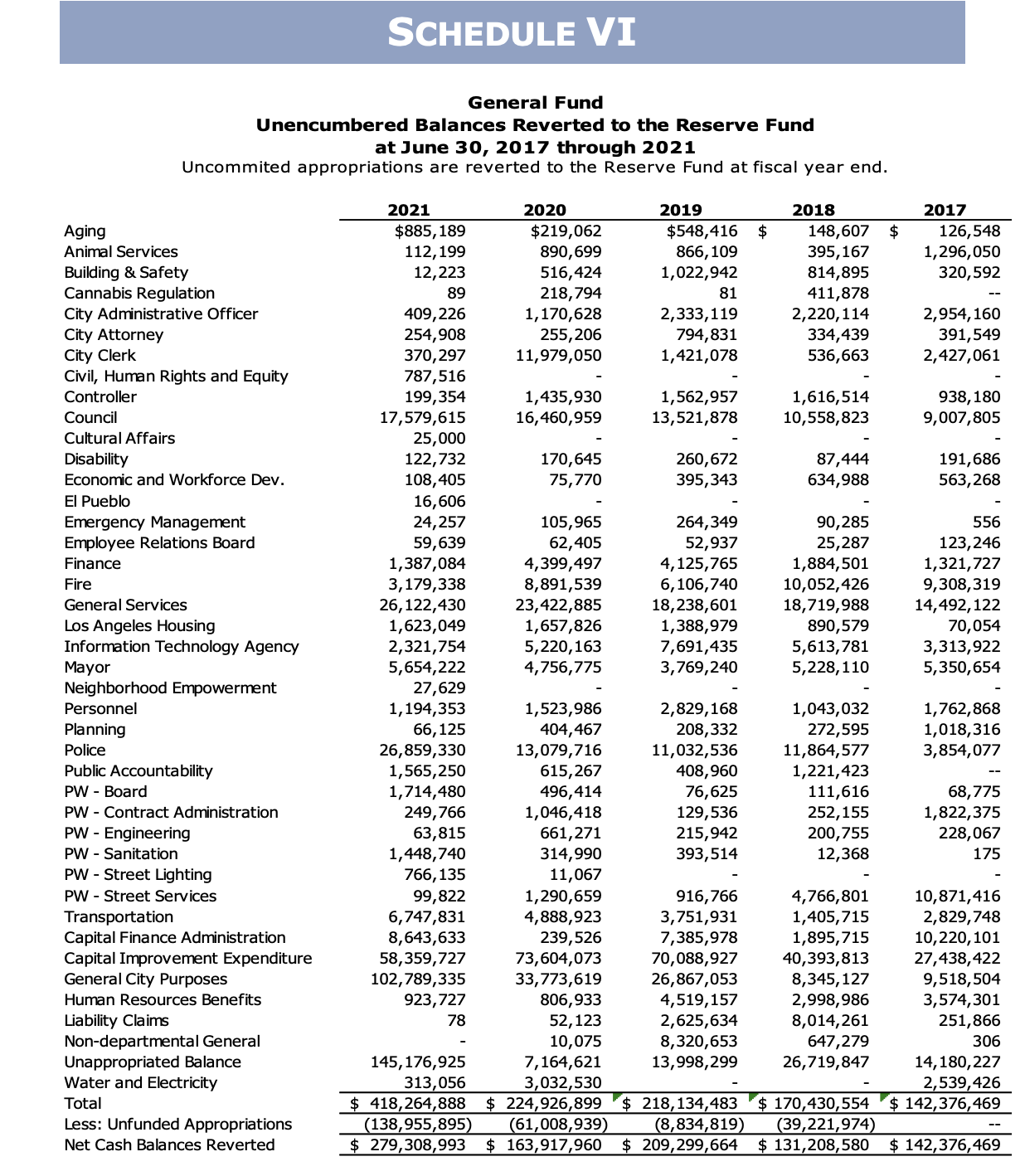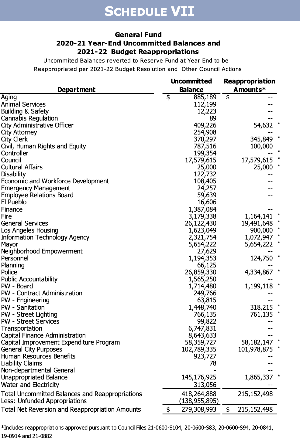 The 2021-22 Budget and other Council actions (C.F. 21-0600-S104, 20-0600-S83, 20-0600-S94, 20-0841, 19-0914, and 21-0882) provided that certain uncommitted balances earmarked for specific programs would be reappropriated in the subsequent year if not expended by the year-end. See Schedule VII for reappropriations by department. Actual reappropriations of $215.2 million were $5.4 million above the estimated $209.8 million Budget.