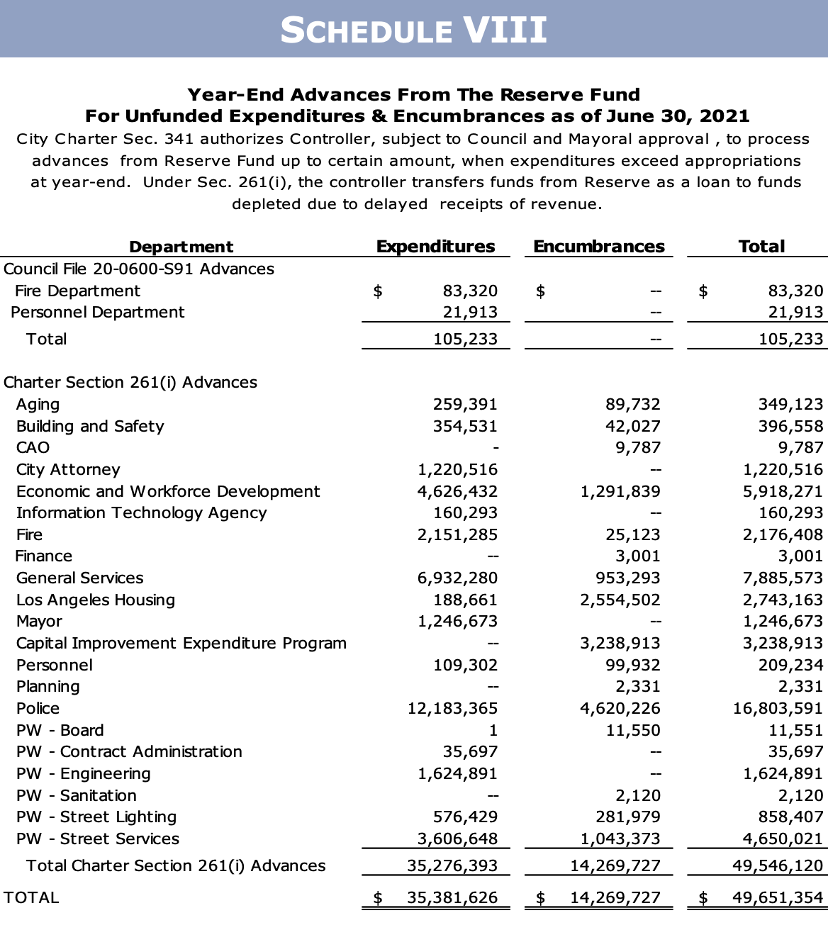 Council File 20-0600-S91 authorized the Controller to borrow from the Reserve Fund at year-end to balance departmental budgets where needed in order to facilitate the closing of the City’s General Ledger. The Controller is authorized to increase appropriations within established limits without getting itemized Mayor and Council approval, a process that would delay the closing of the City’s General Ledger. Advances were made to Fire and Personnel Departments in the amount of $83,320 and $21,913 respectively.