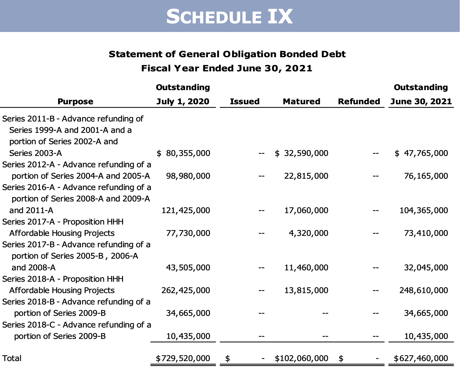 The actual ratio of Debt Service to General Fund Receipts (excluding the ARPA transfer of $639.5 million) was 4.92 percent in 2020-21, comprised of 2.89 percent for non-voter approved debt and 2.03 percent for voter approved debt. The ratio decreased due to defeasance and advance refunding of MICLA Revenue Bonds Series 2014 and 2019. Schedule IX shows the details of Outstanding General Obligation Bonded Debt.