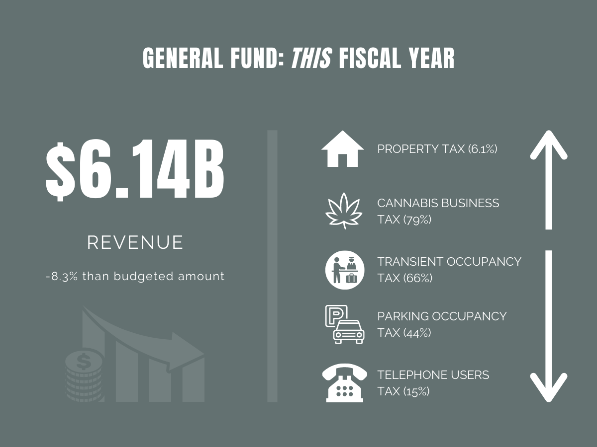 The City’s adopted budget this fiscal year, FY21, totals $10.53 billion. Two-thirds of that, $6.68 billion, consists of General Fund revenues, while the rest, $3.85 billion, comes from hundreds of special purpose funds and available balances. The updated estimate of General Fund receipts for the current fiscal year is $6.14 billion, 8.3% lower than the budgeted amount and 3.7% below the last fiscal year. This means the General Fund will have a $549 million revenue shortfall. Property tax revenues likely will increase by 6.1% and cannabis business taxes by 79% ($139 million), but will be offset by dramatic shortfalls in transient occupancy tax (down 66%), parking occupancy tax (down 44%), and telephone users tax (down 15%) receipts, among others.