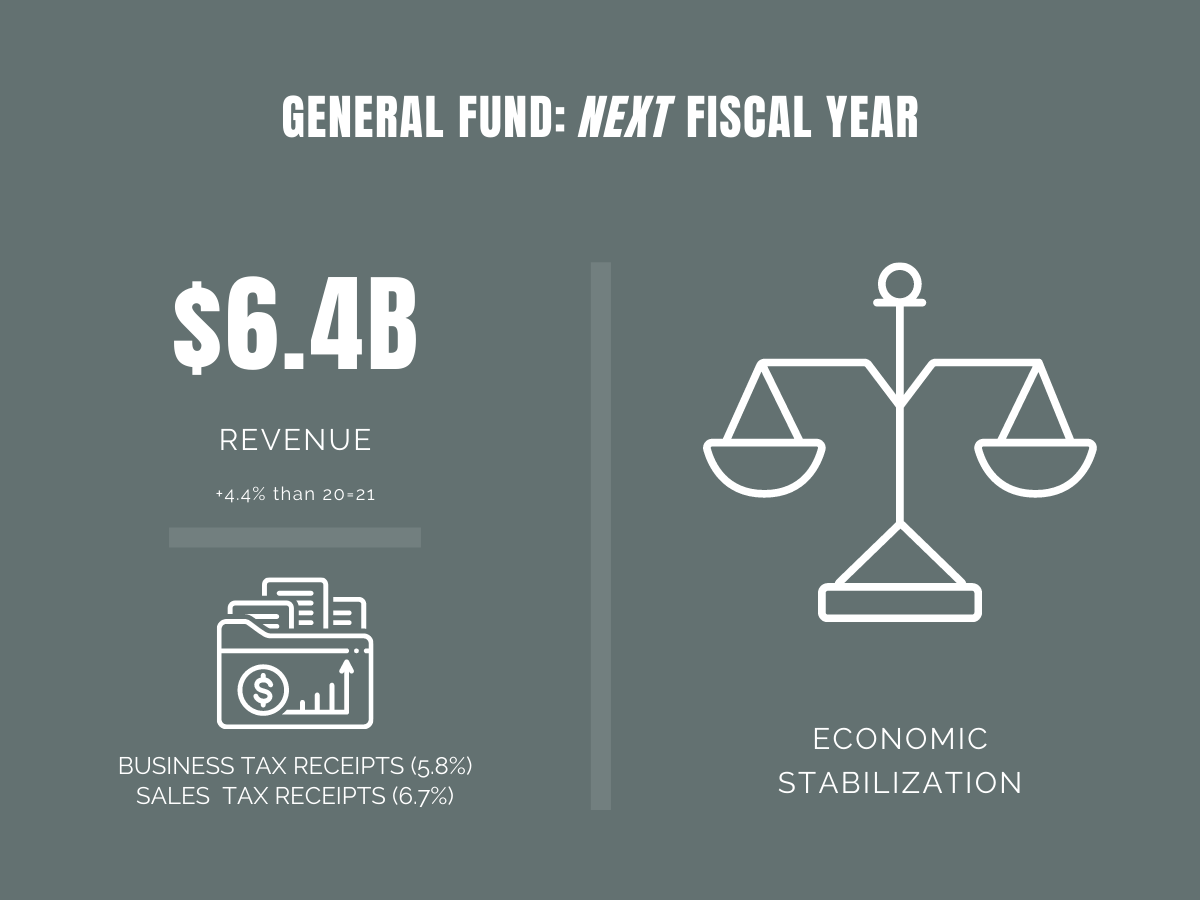 General Fund receipts for FY22 are projected to be $6.4 billion, an increase of 4.4% over FY21 estimates. The revenues growing in the current year should continue to increase, along with 5.8% growth in business tax receipts and a 6.7% increase in sales tax receipts. Transient occupancy tax receipts are likely to increase in the second half of FY22, but will remain well below pre-pandemic levels. This revenue category has been hit the hardest by COVID-19 as travel and hospitality slowed to a near stop once the pandemic took hold, and is expected to take the longest to recover.