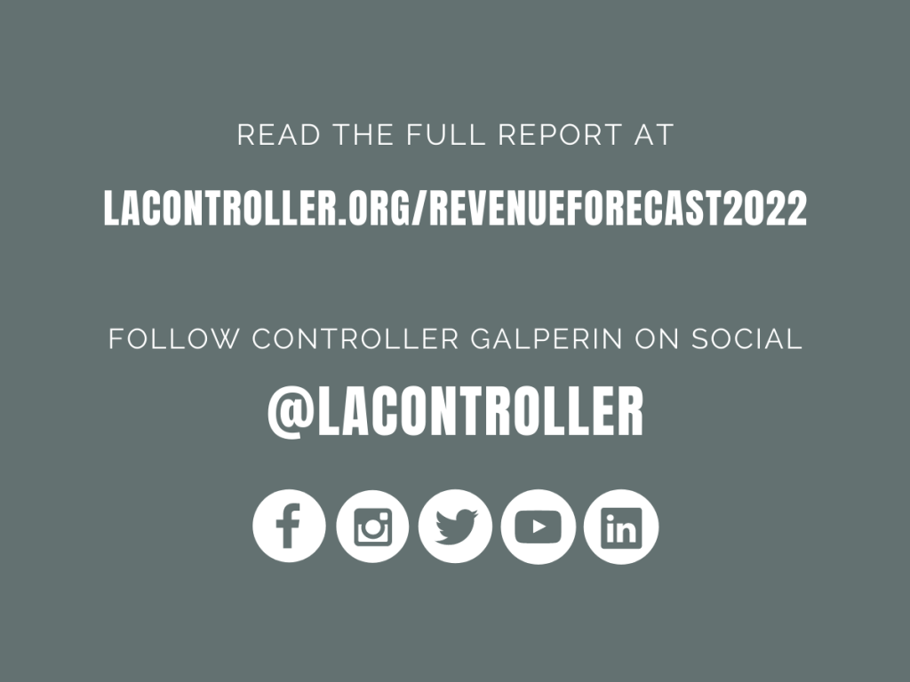 Another factor that looms large when discussing the City’s recovery is the prospective infusion of additional federal and state relief funds, which would bolster L.A.’s coffers considerably. Under the current plan before Congress, the City could receive more than $1.2 billion to replace lost revenue, protect core services and assist with pandemic response efforts. Because this relief funding has not yet been secured, it is not included in these revenue projections.